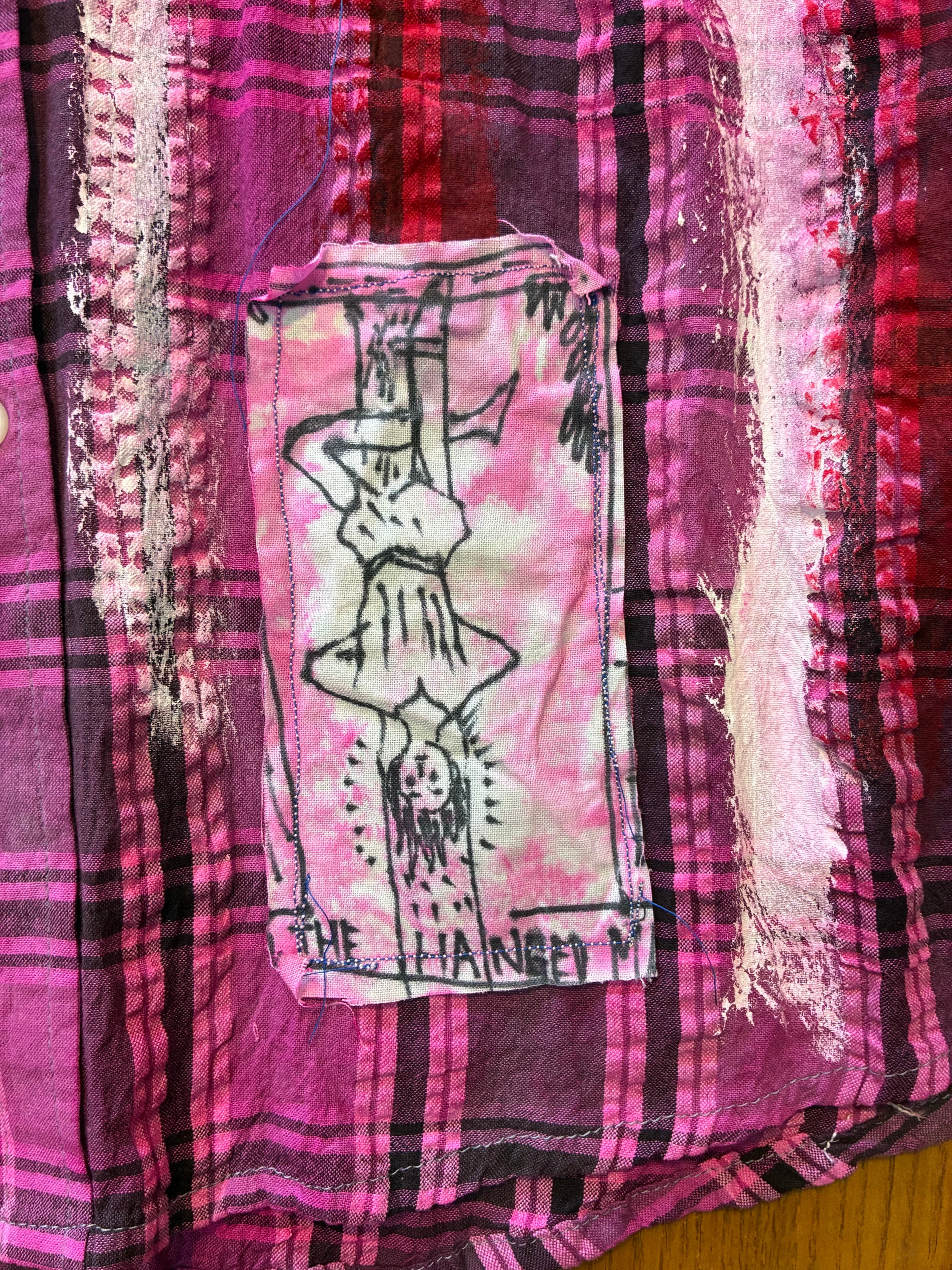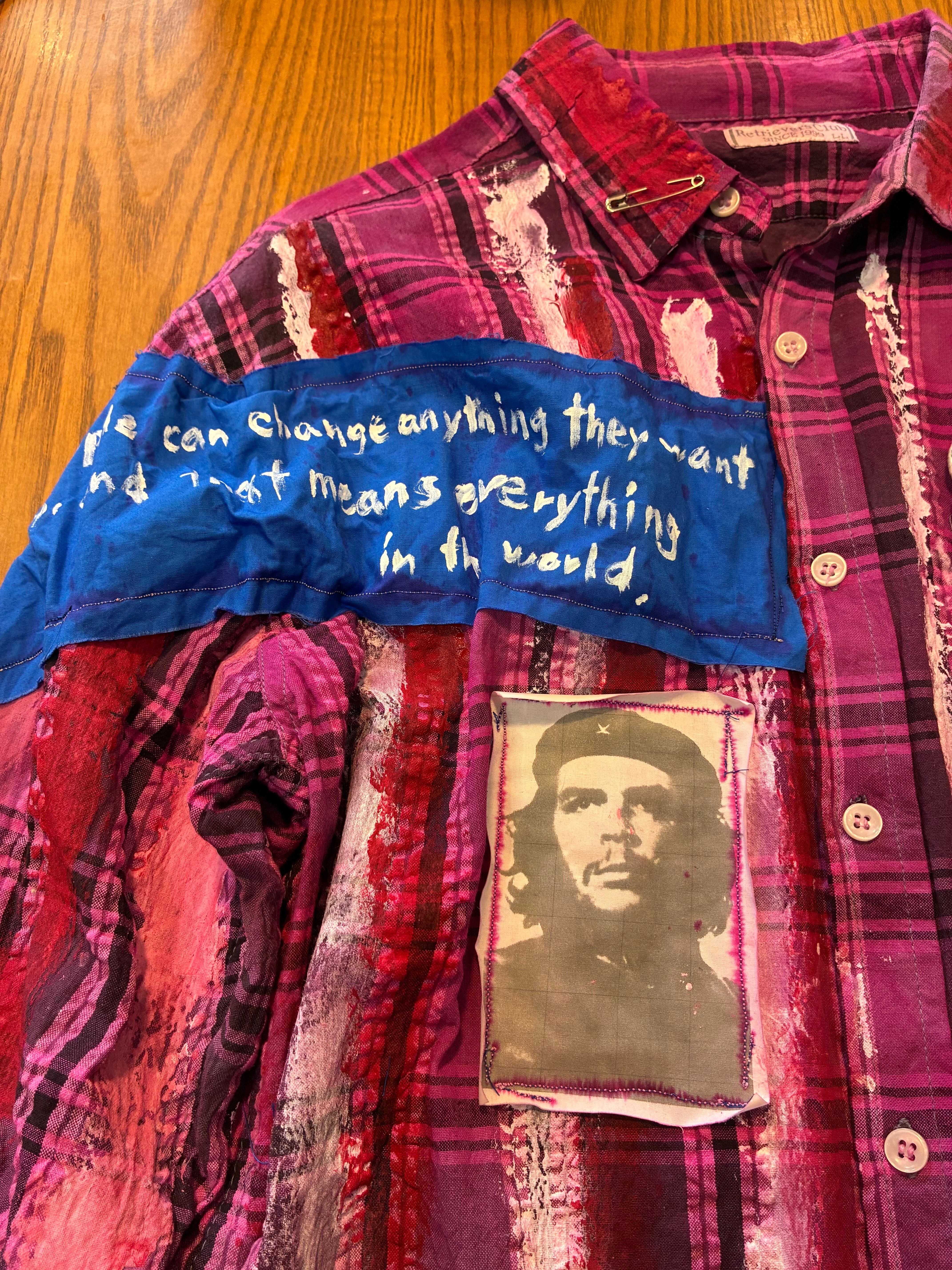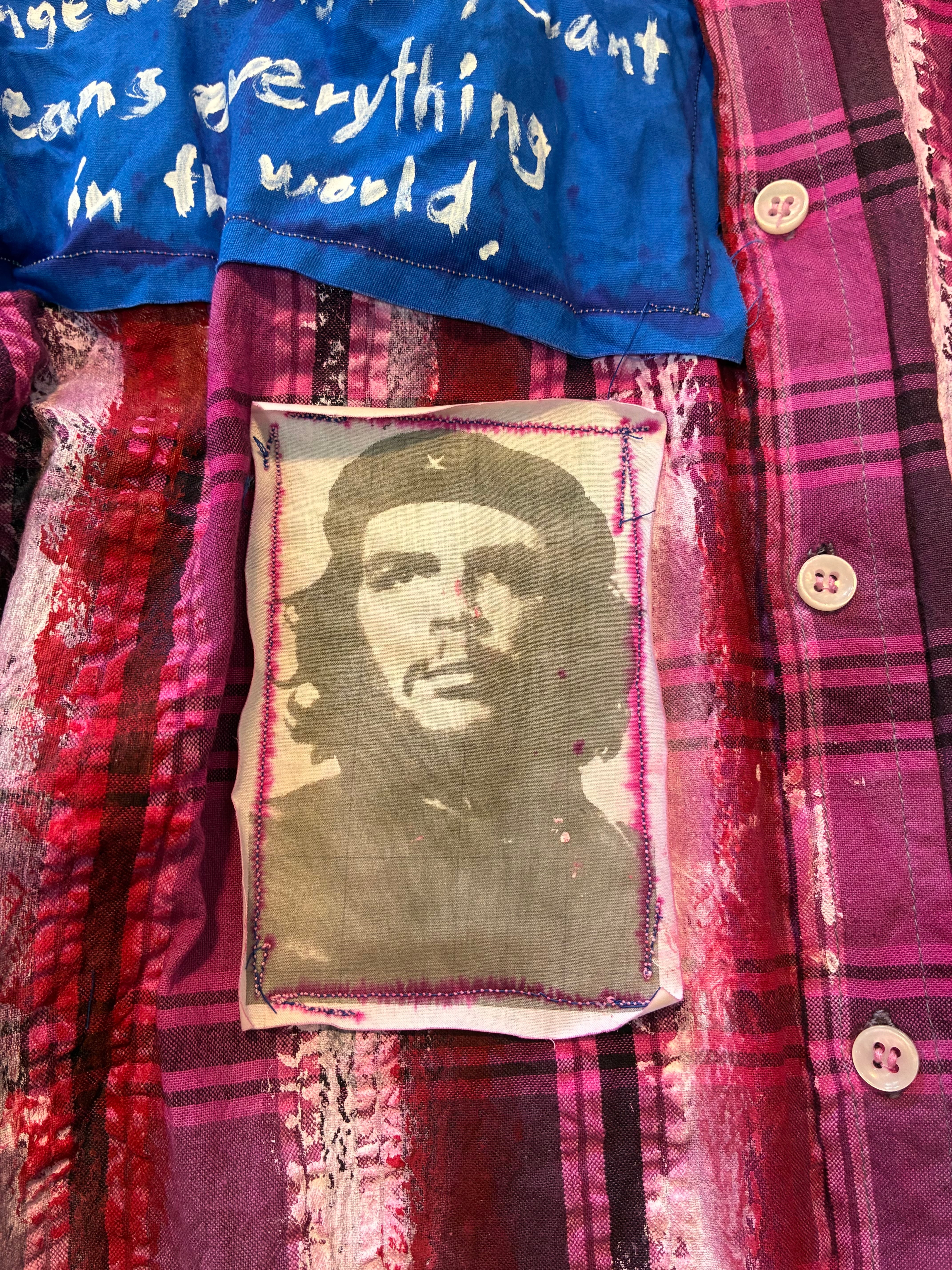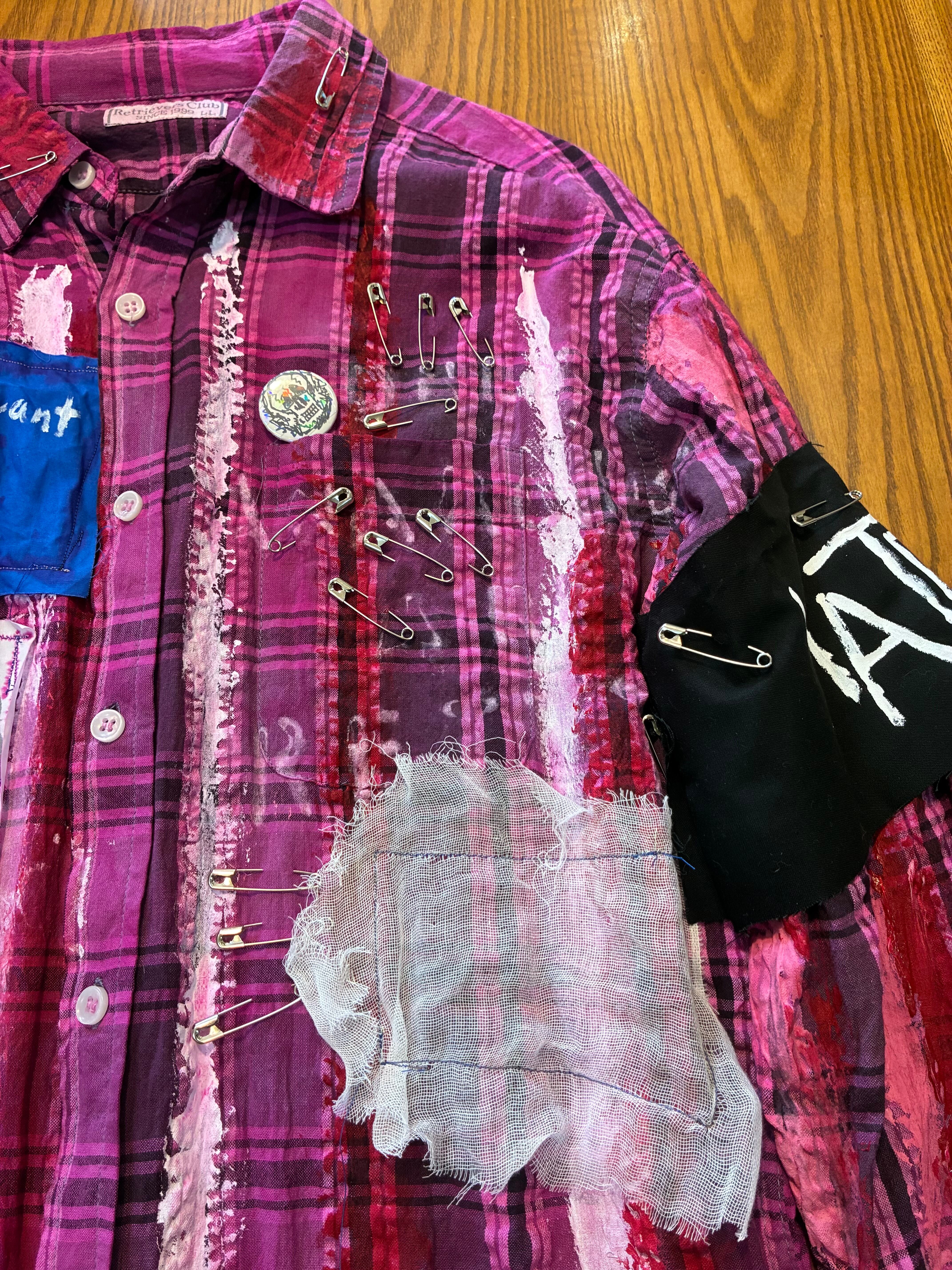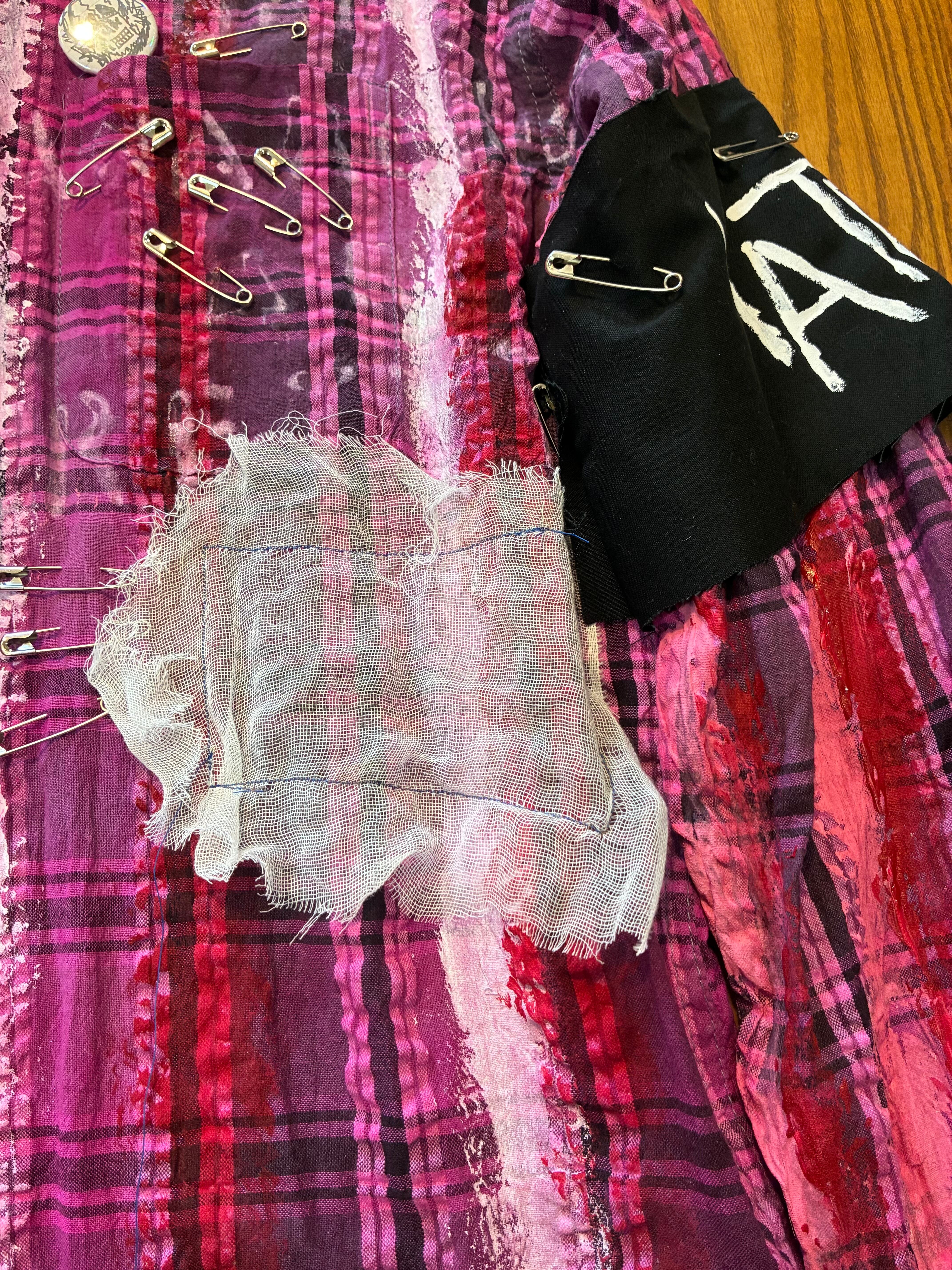 スローガンパッチ、ゲバラのパッチ、絵の具でのペイント、安全ピン、缶バッジ、タロットのハングドマンのドローイング布パッチ、医療用ガーゼの縫い付け、などの加工をしました。ジョーストラマーの名言を青パッチに書きました。