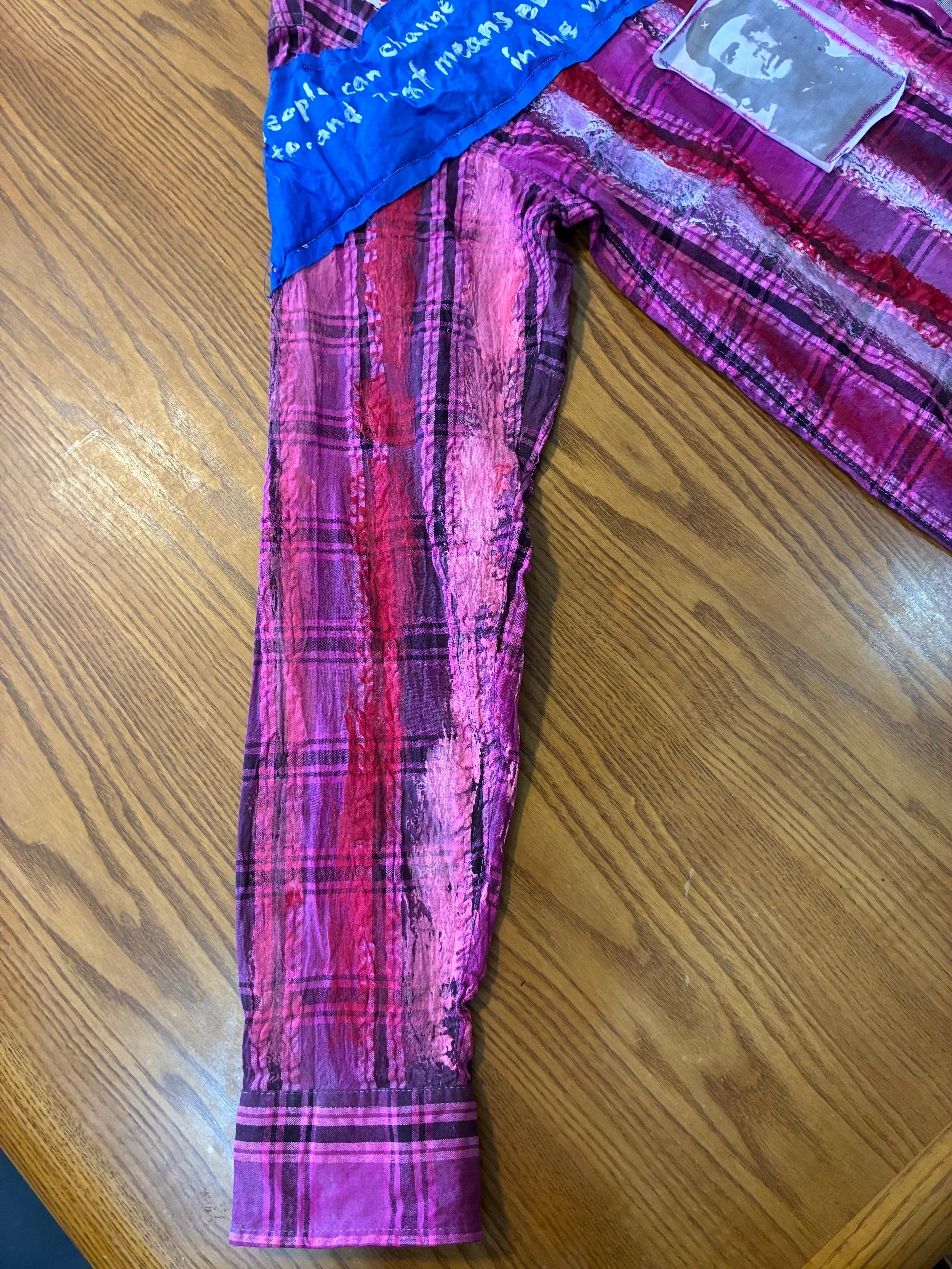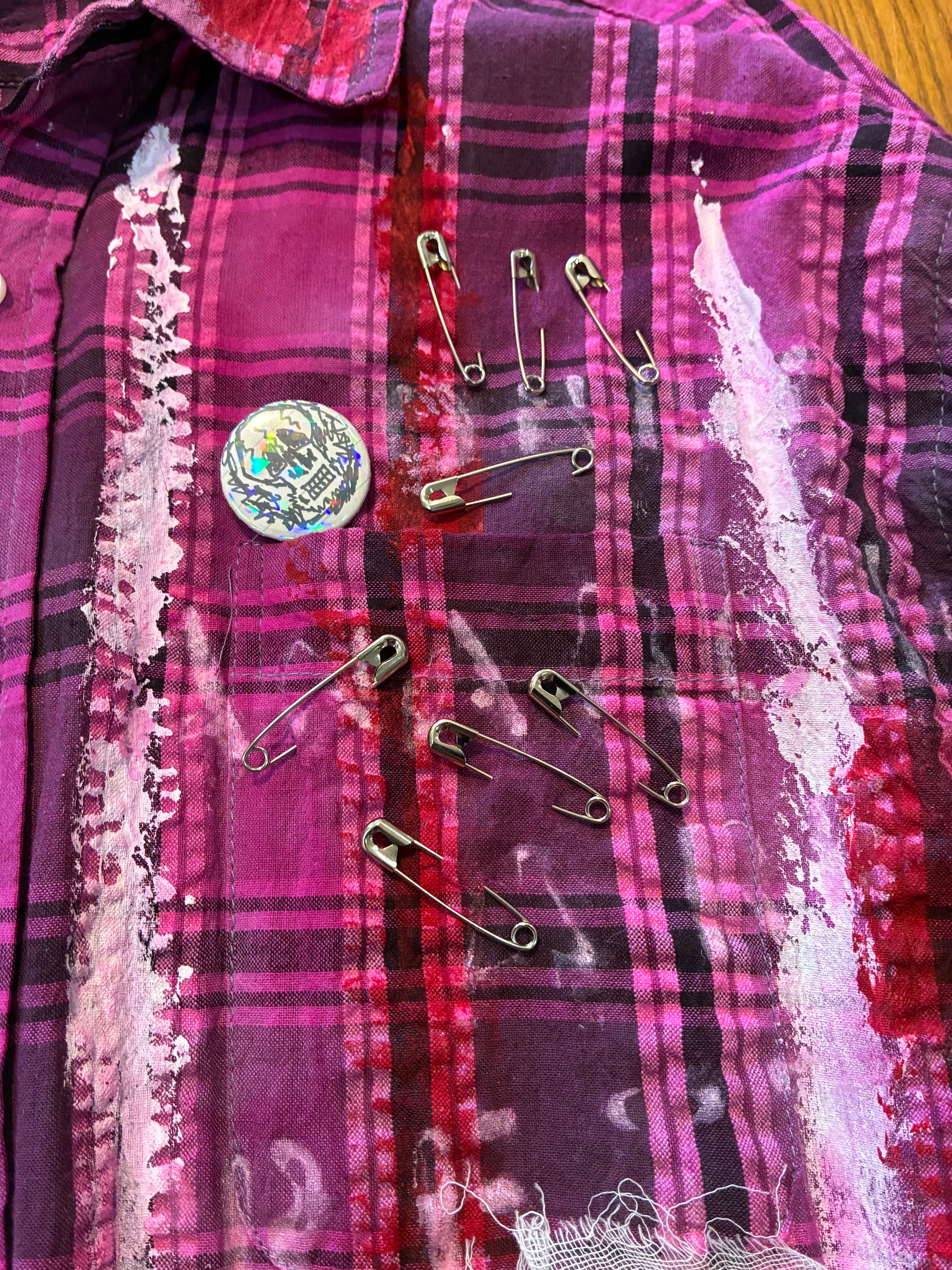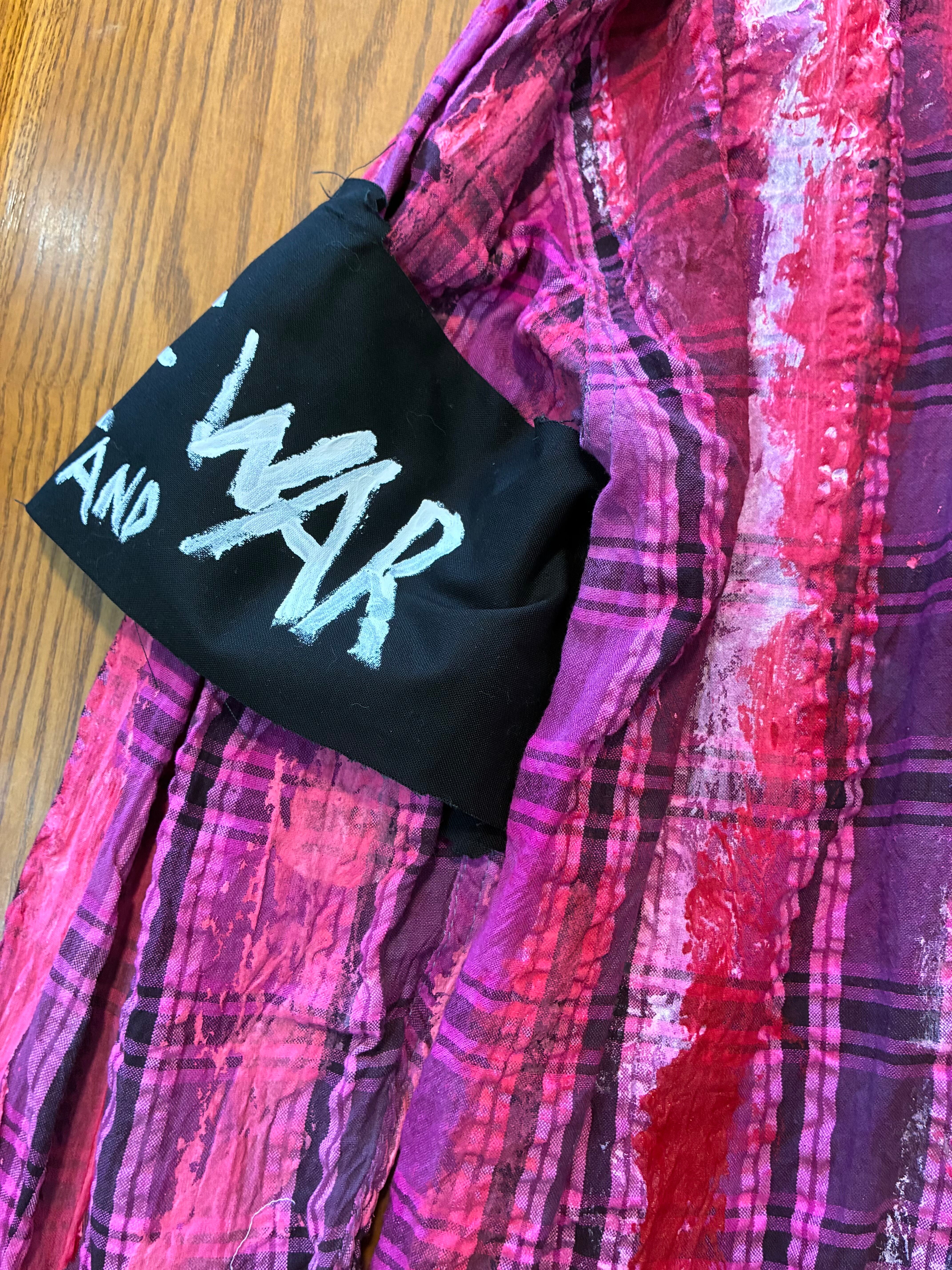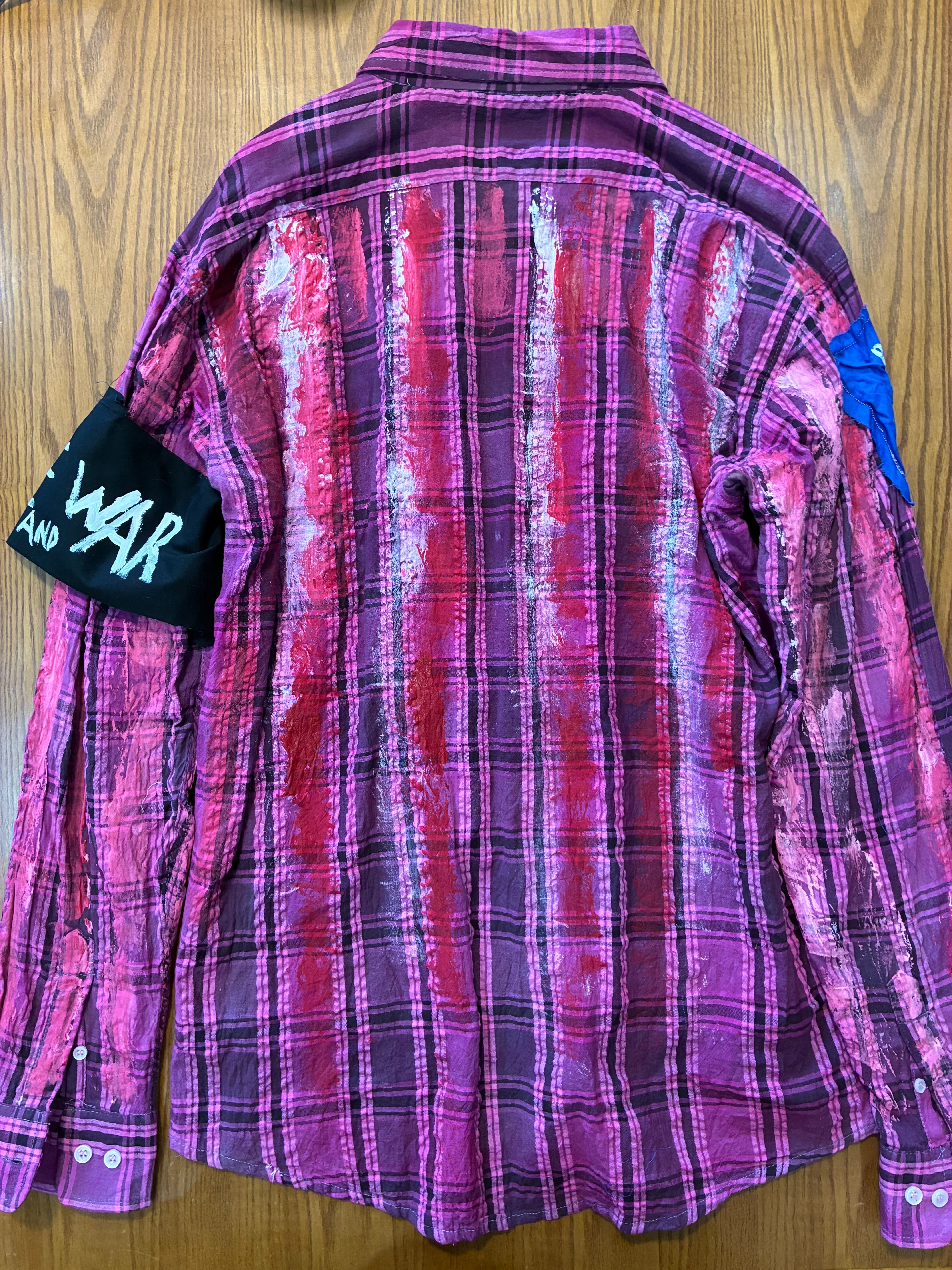 スローガンパッチ、ゲバラのパッチ、絵の具でのペイント、安全ピン、缶バッジ、タロットのハングドマンのドローイング布パッチ、医療用ガーゼの縫い付け、などの加工をしました。ジョーストラマーの名言を青パッチに書きました。
