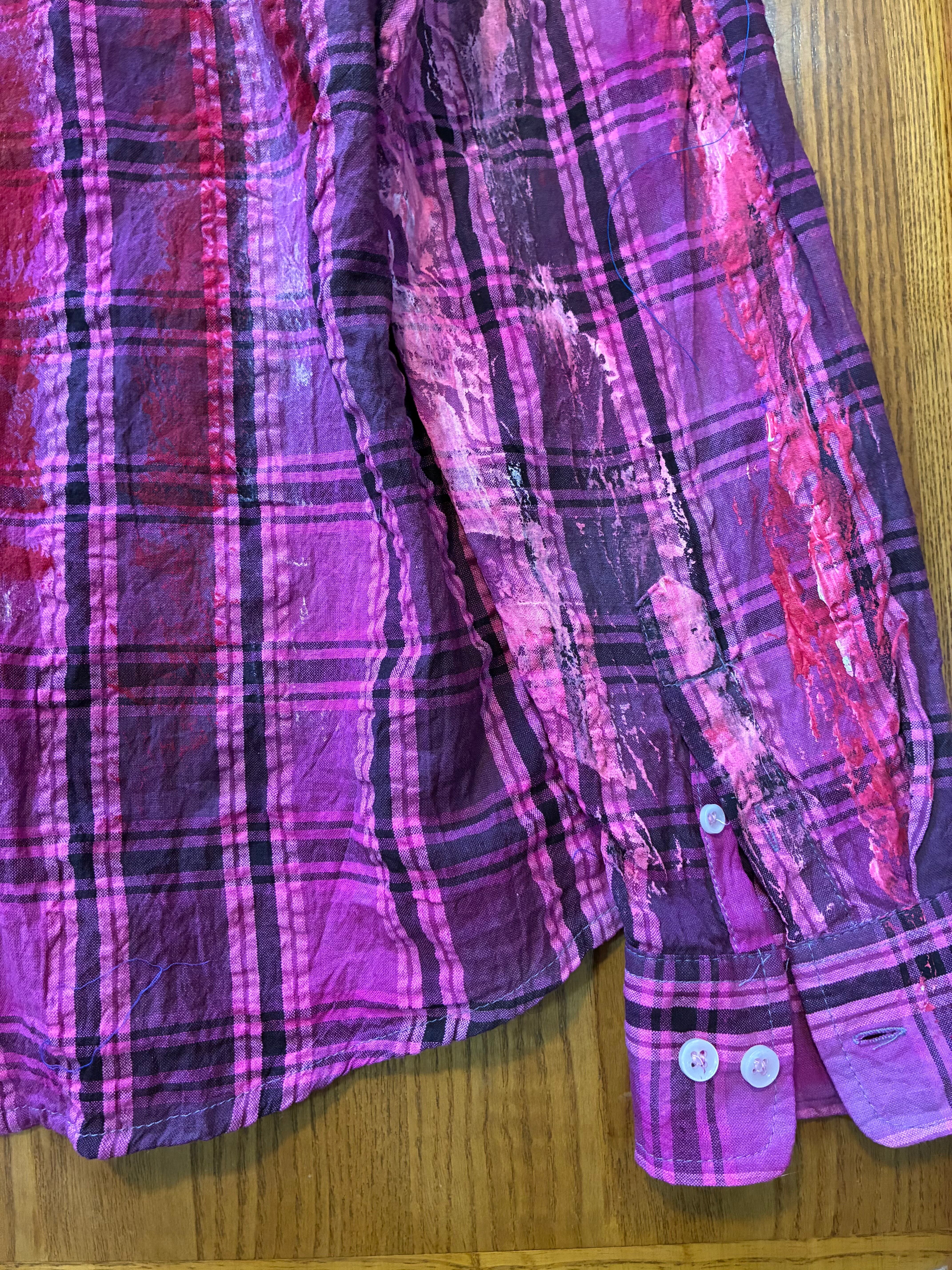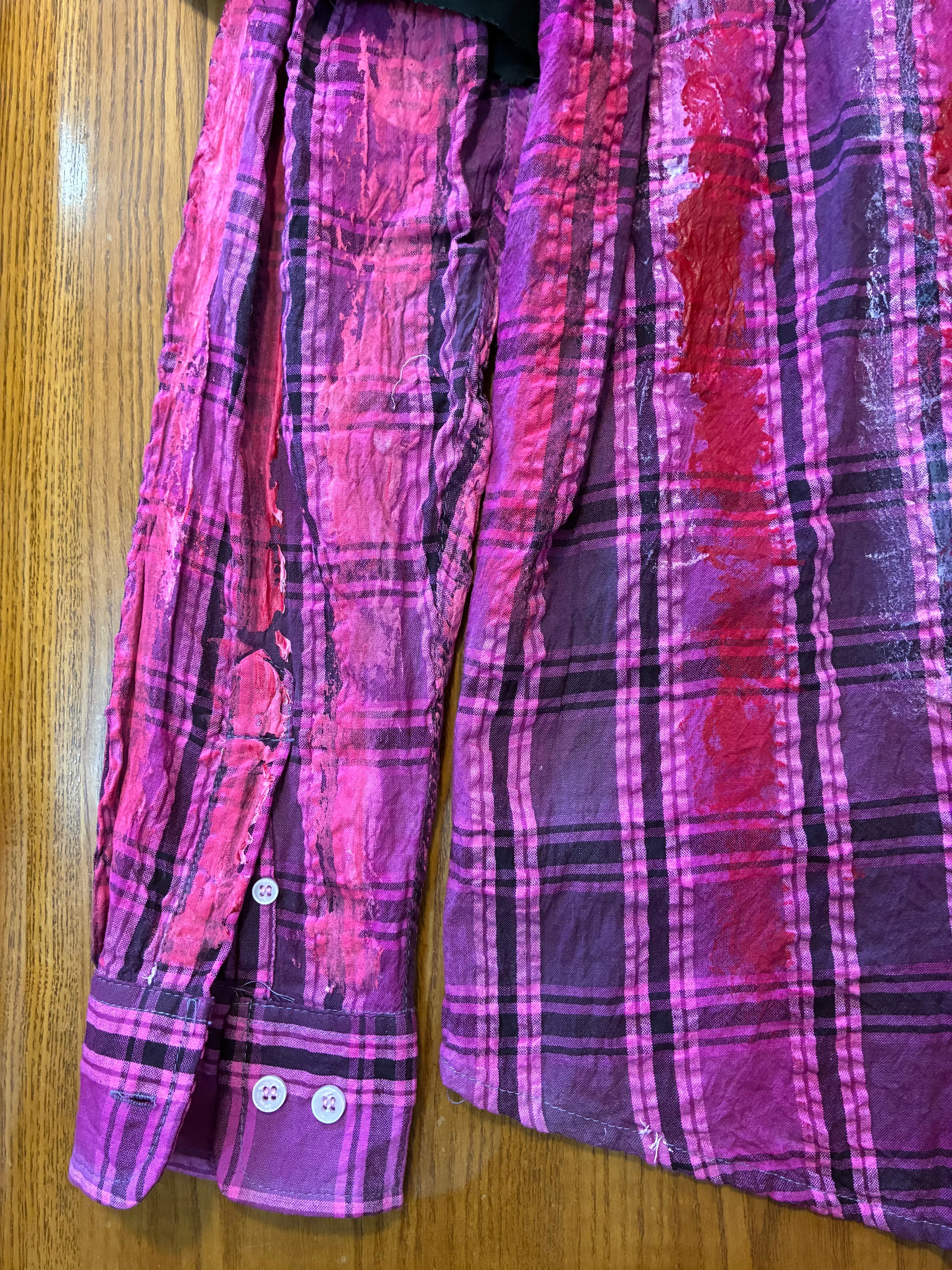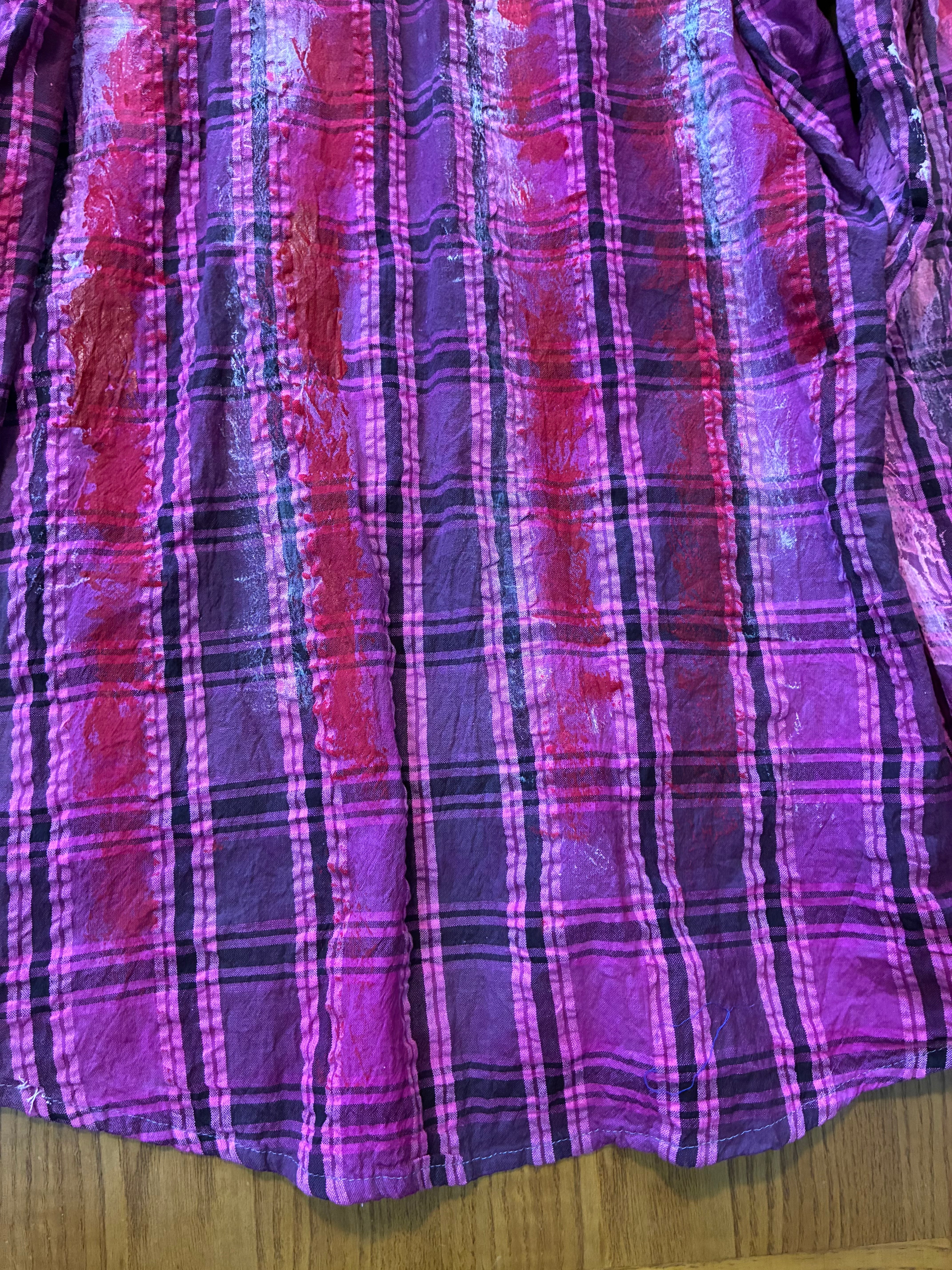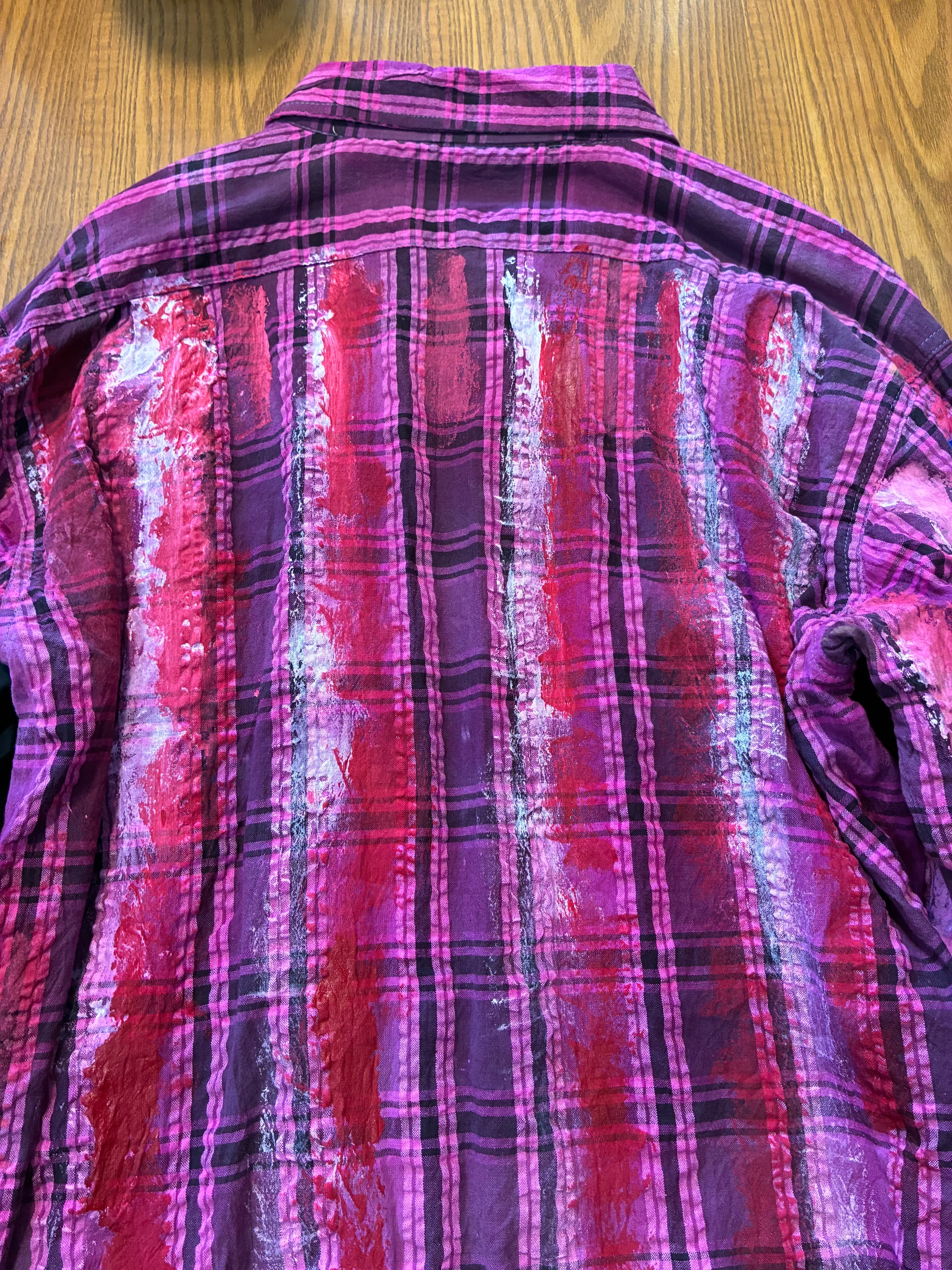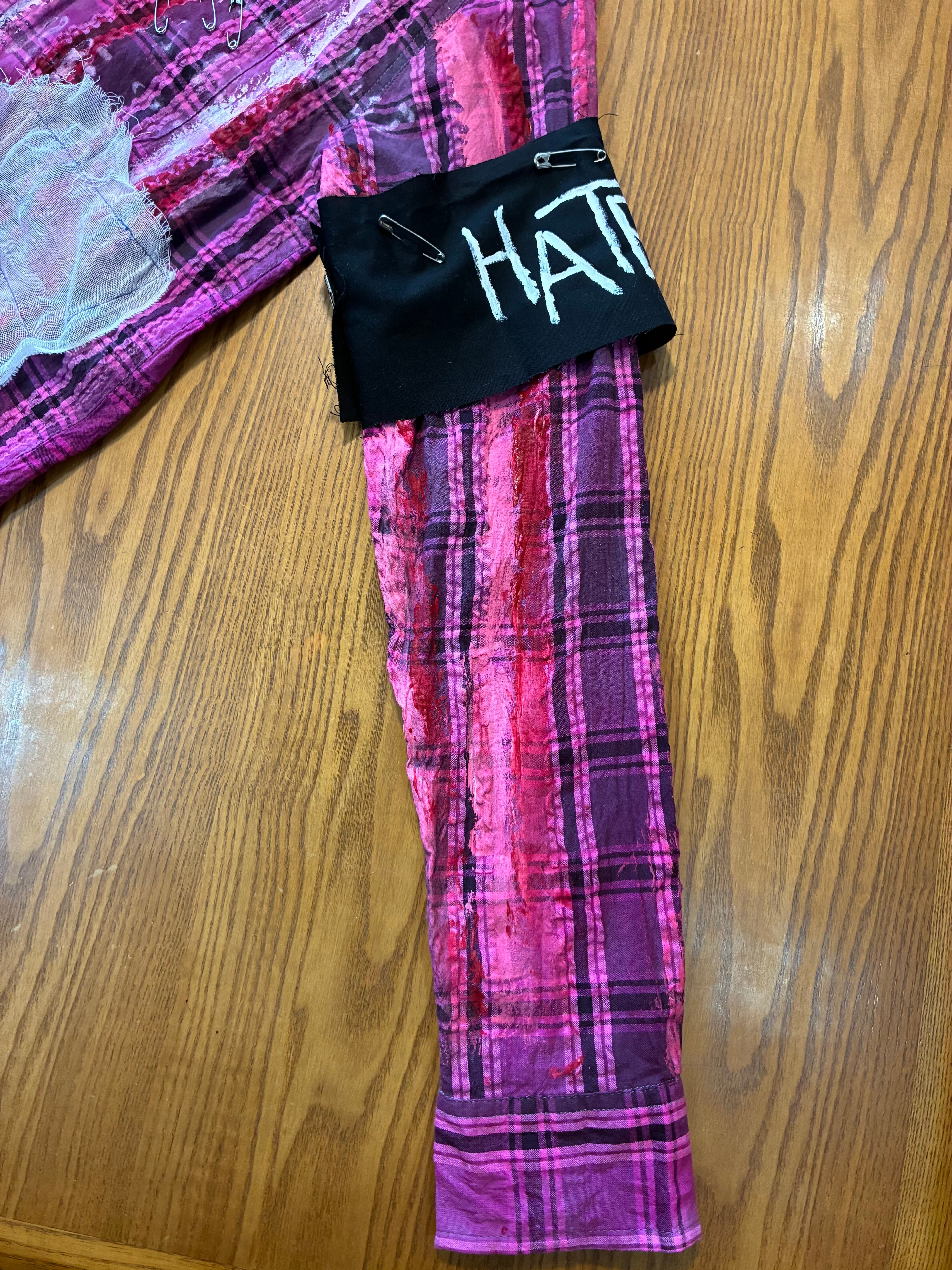 スローガンパッチ、ゲバラのパッチ、絵の具でのペイント、安全ピン、缶バッジ、タロットのハングドマンのドローイング布パッチ、医療用ガーゼの縫い付け、などの加工をしました。ジョーストラマーの名言を青パッチに書きました。