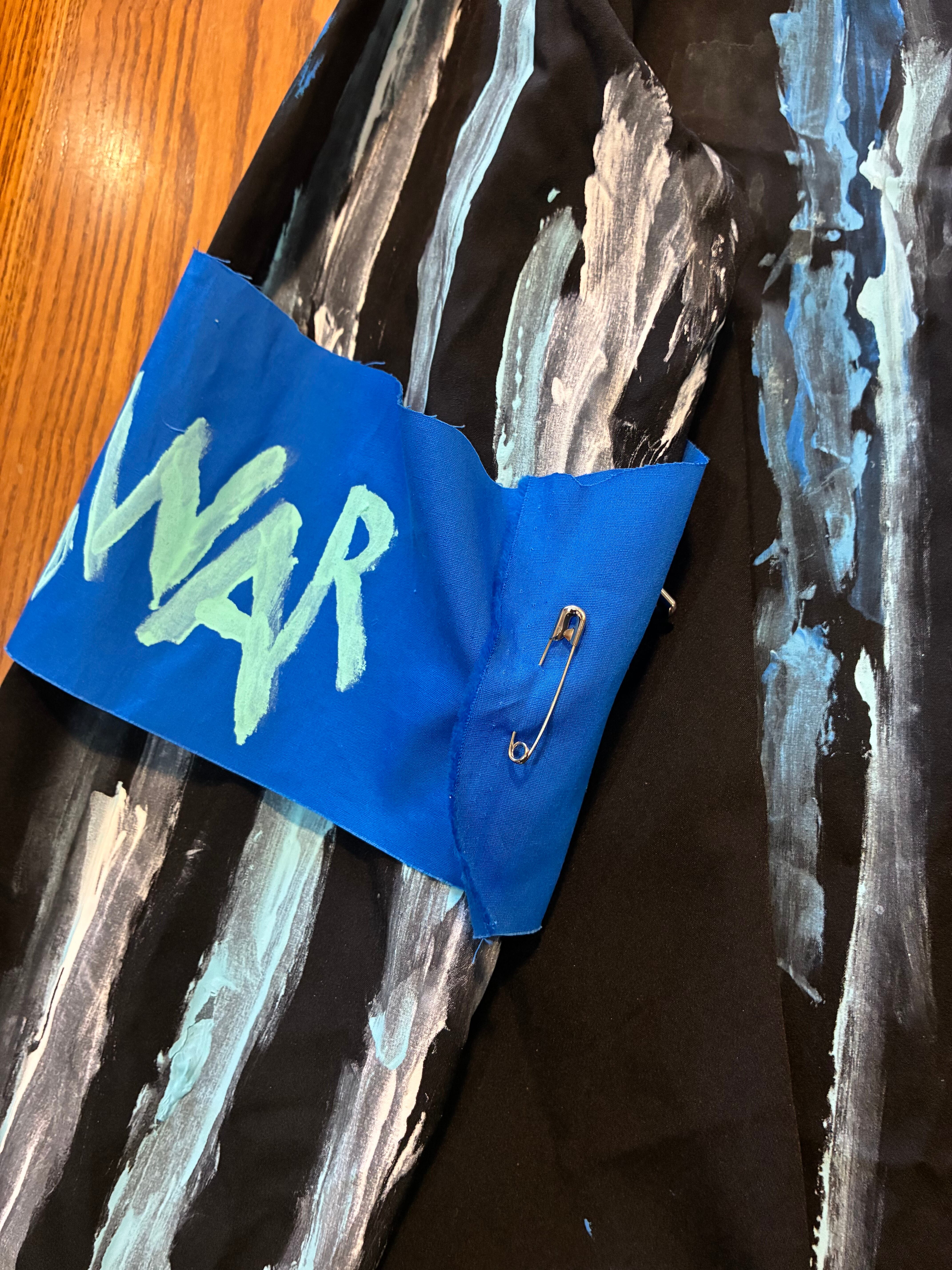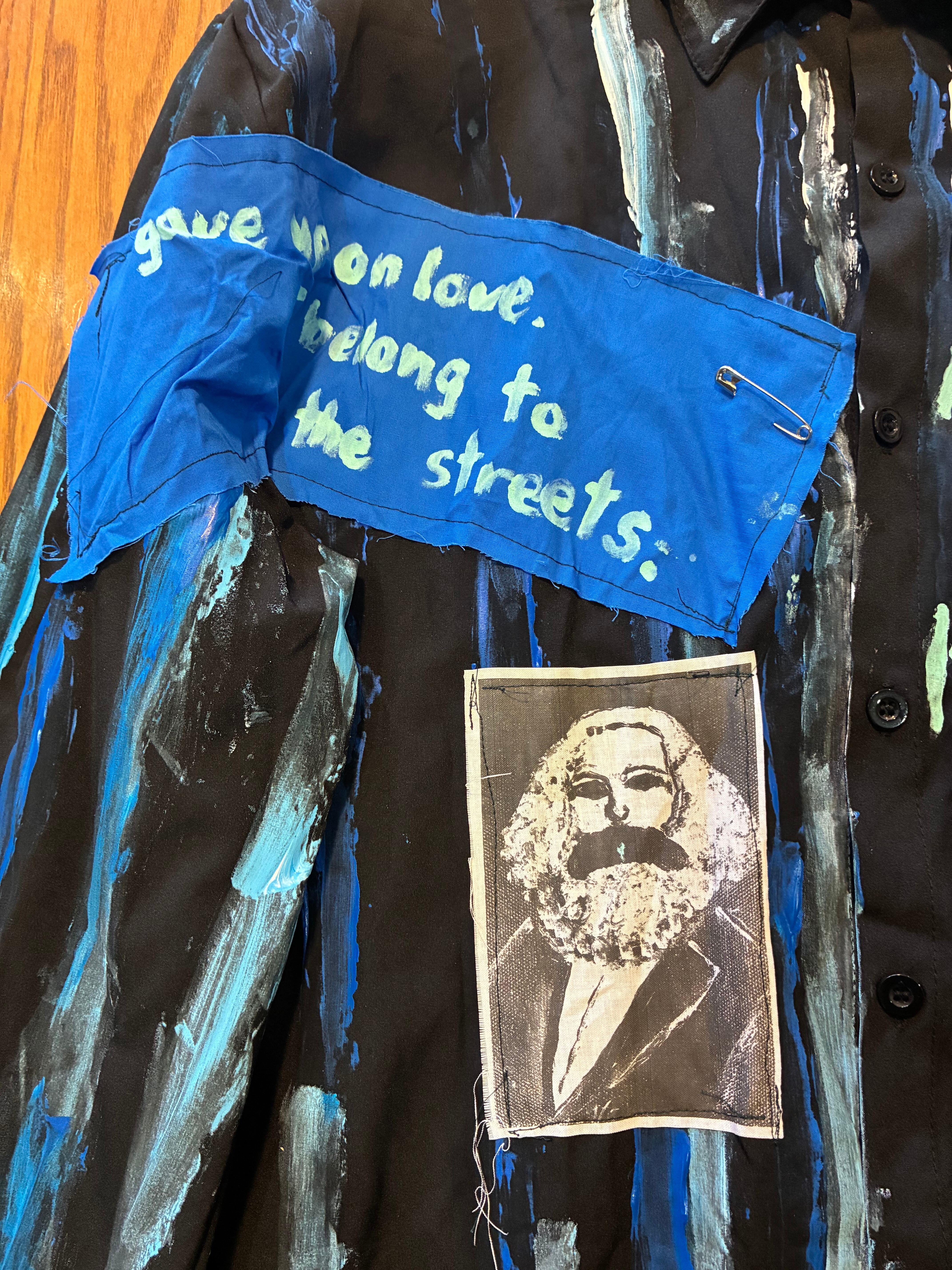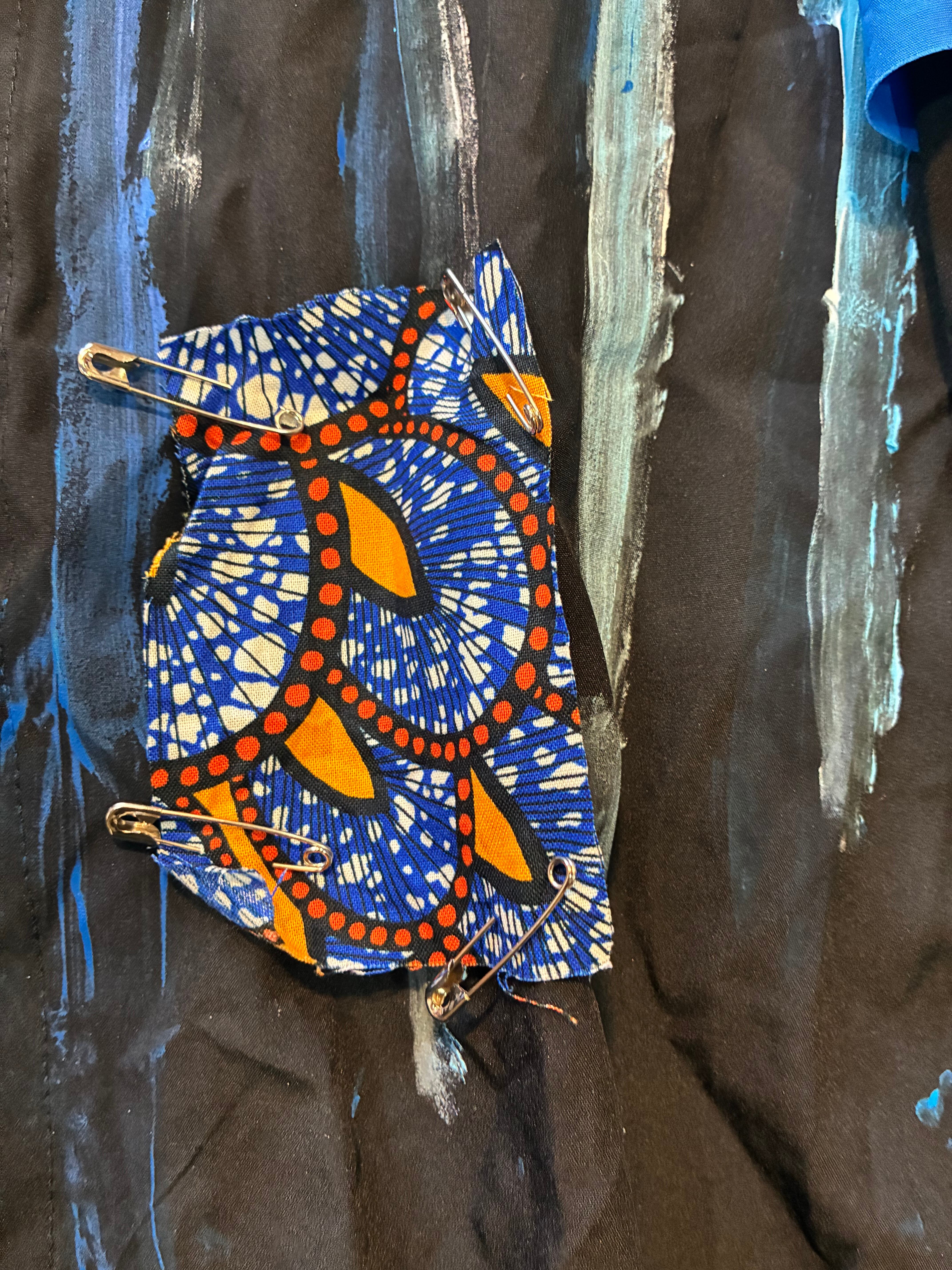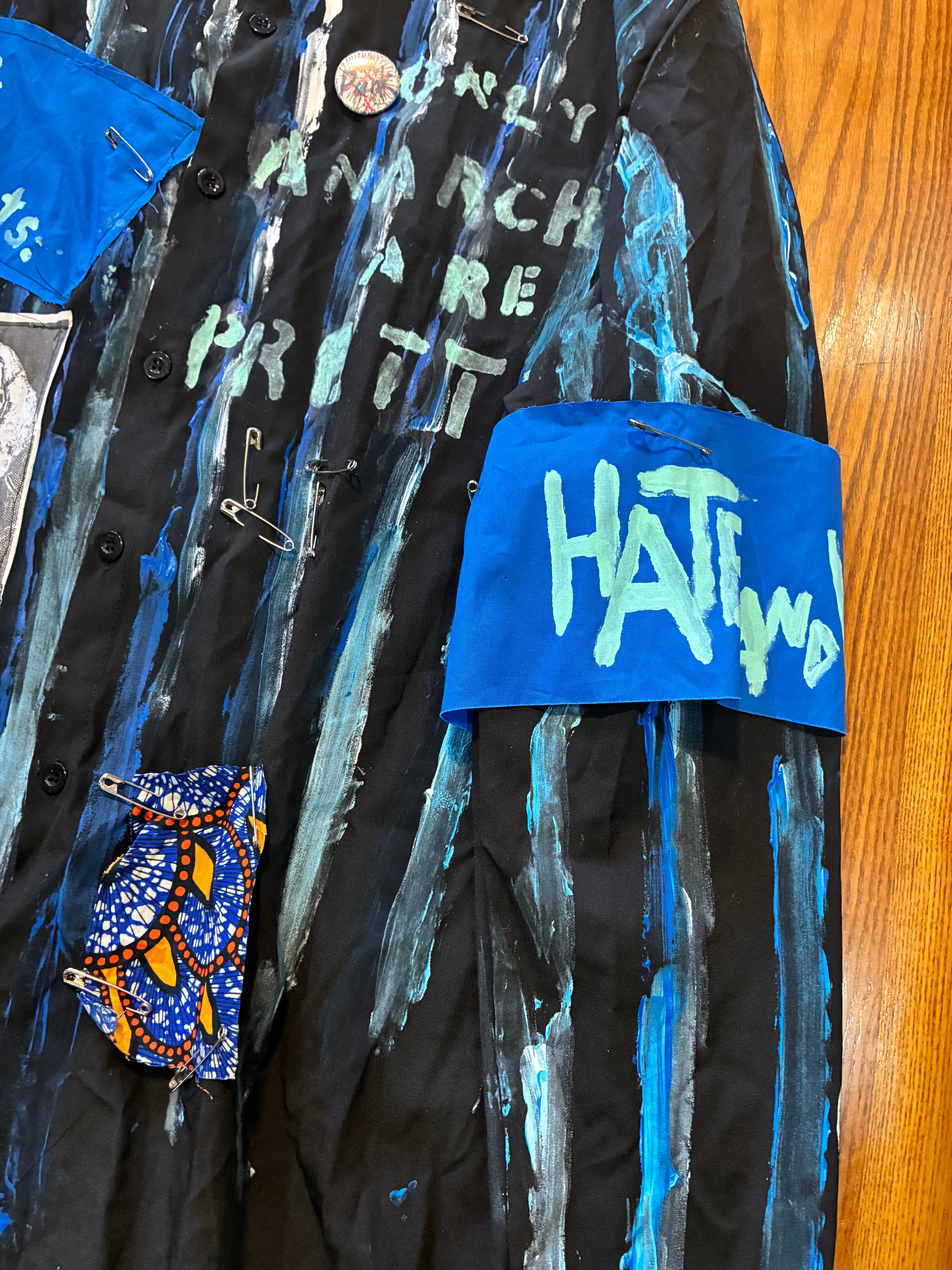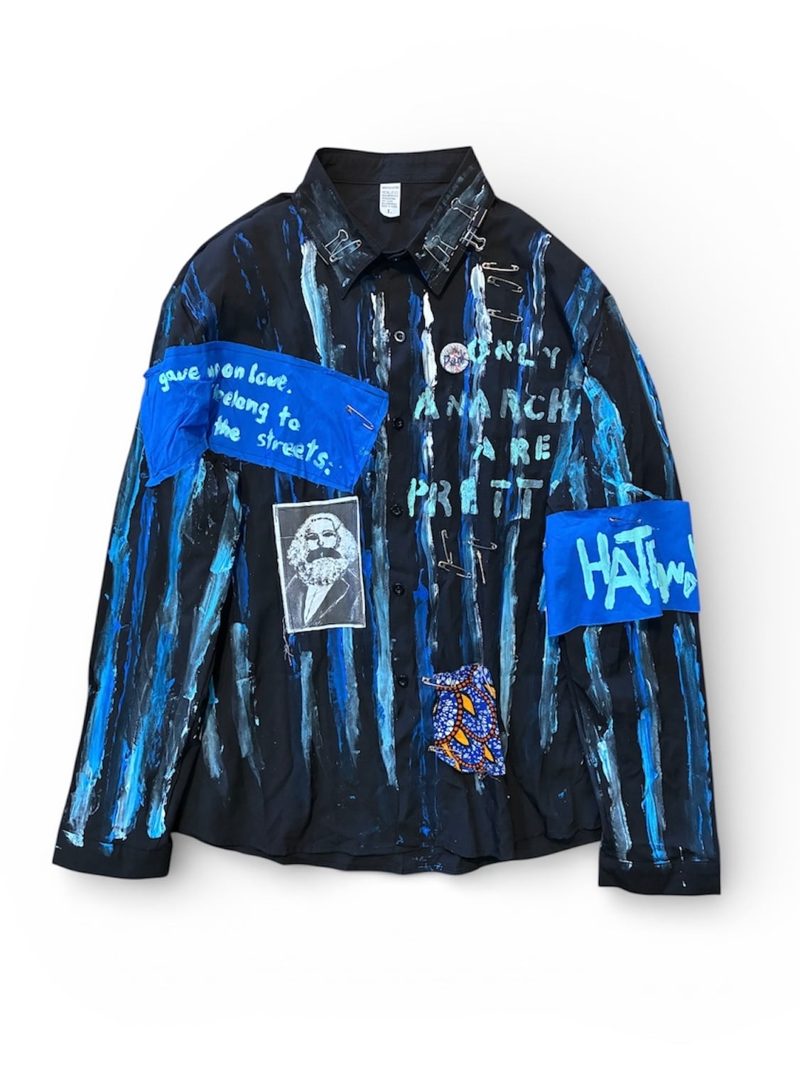 スローガンパッチ、手書きのマルクスのプリント布パッチ、絵の具でのペイント、安全ピン、缶バッジ、クリップとめ、アフリカン生地安全ピン止め、腕章、などの加工をしました。青い布パッチは自作の散文を書きました。