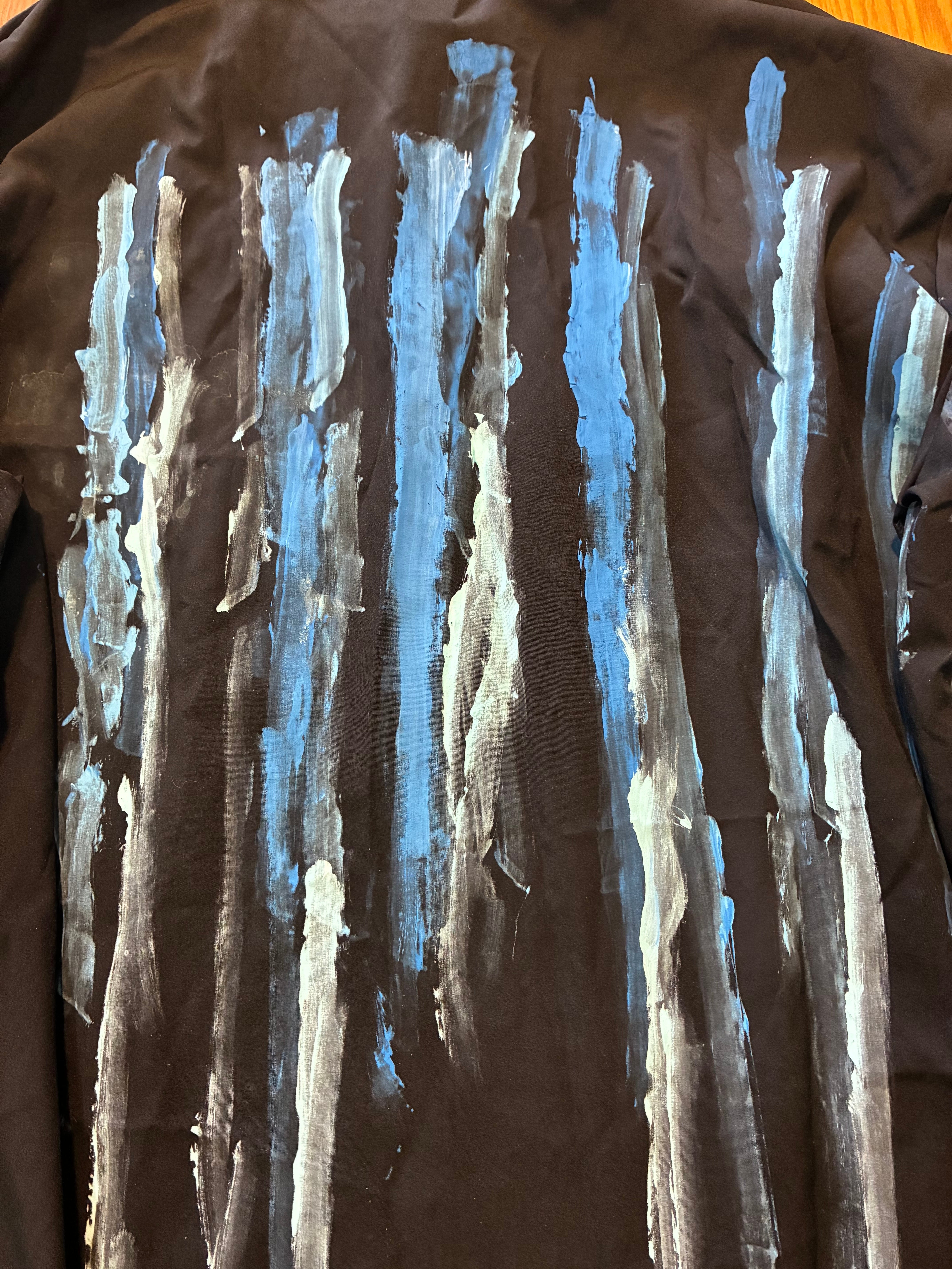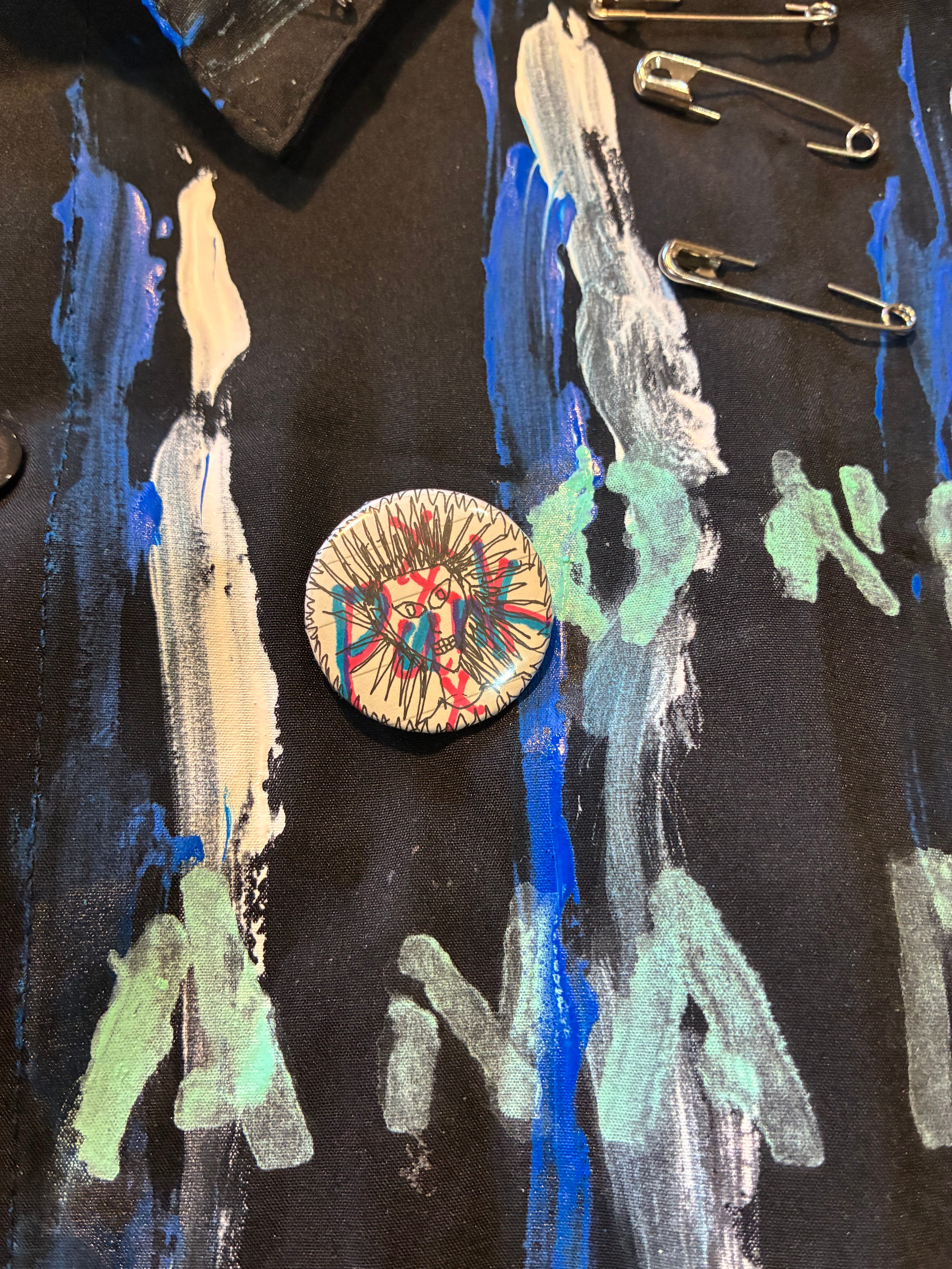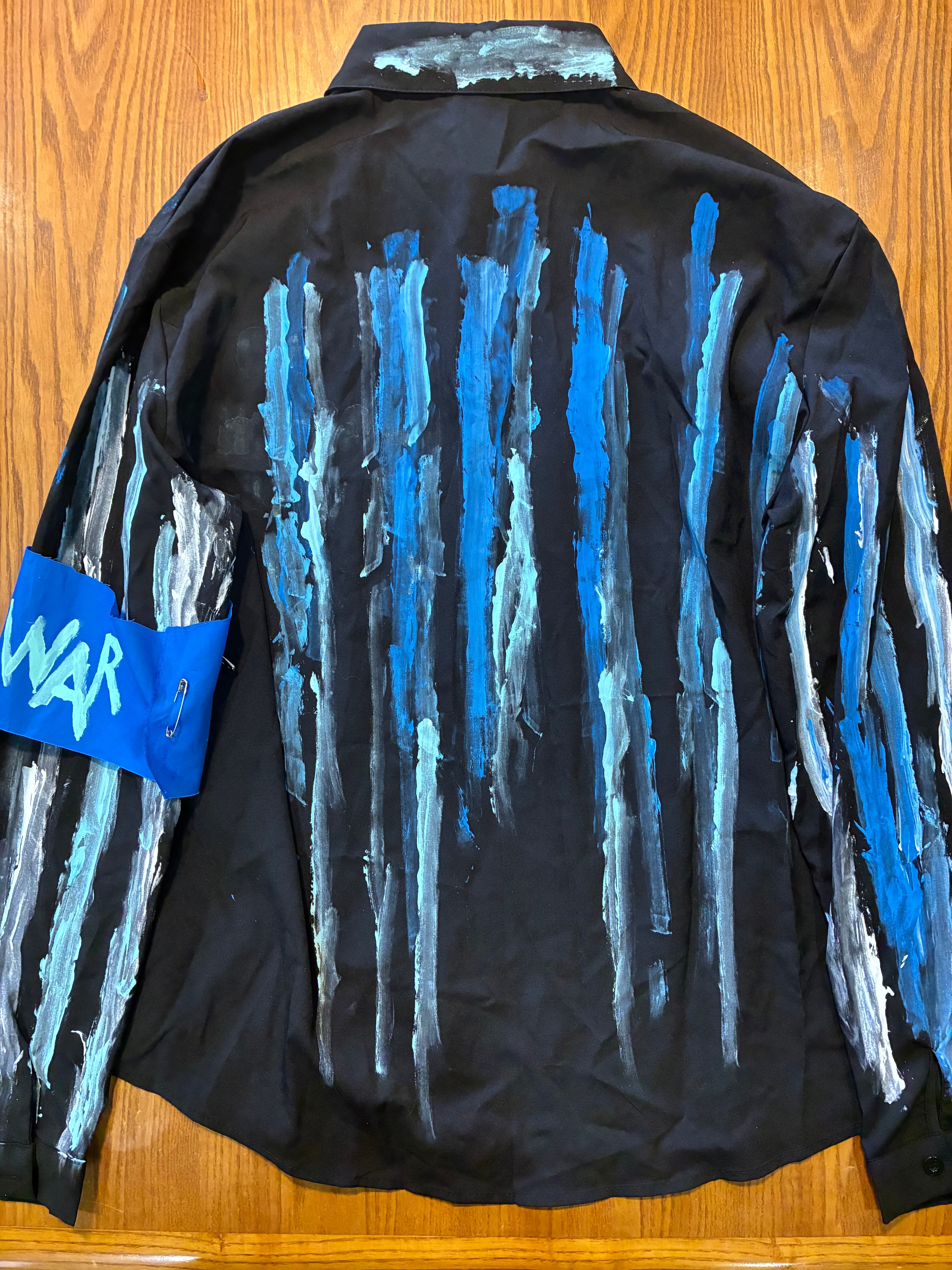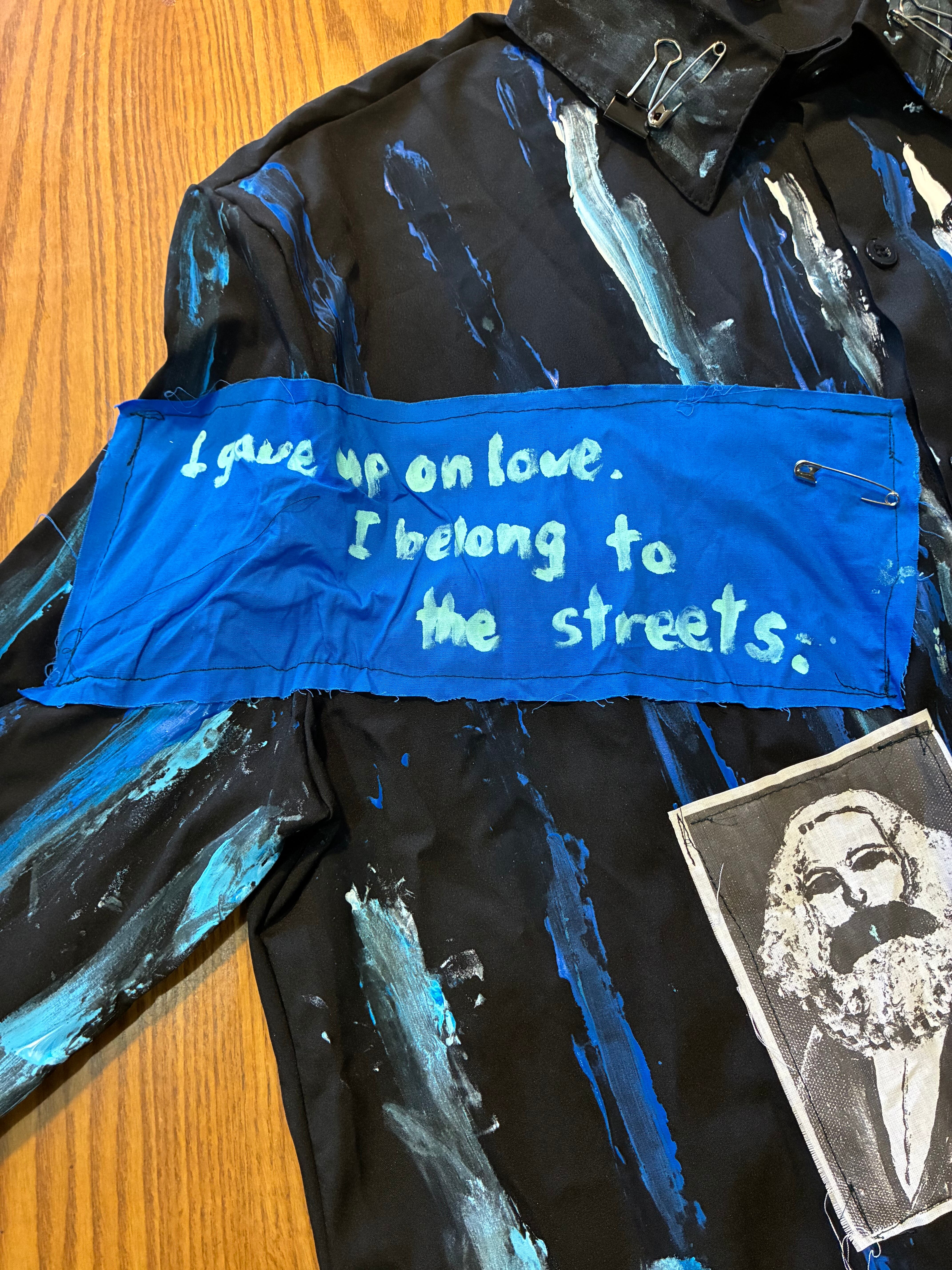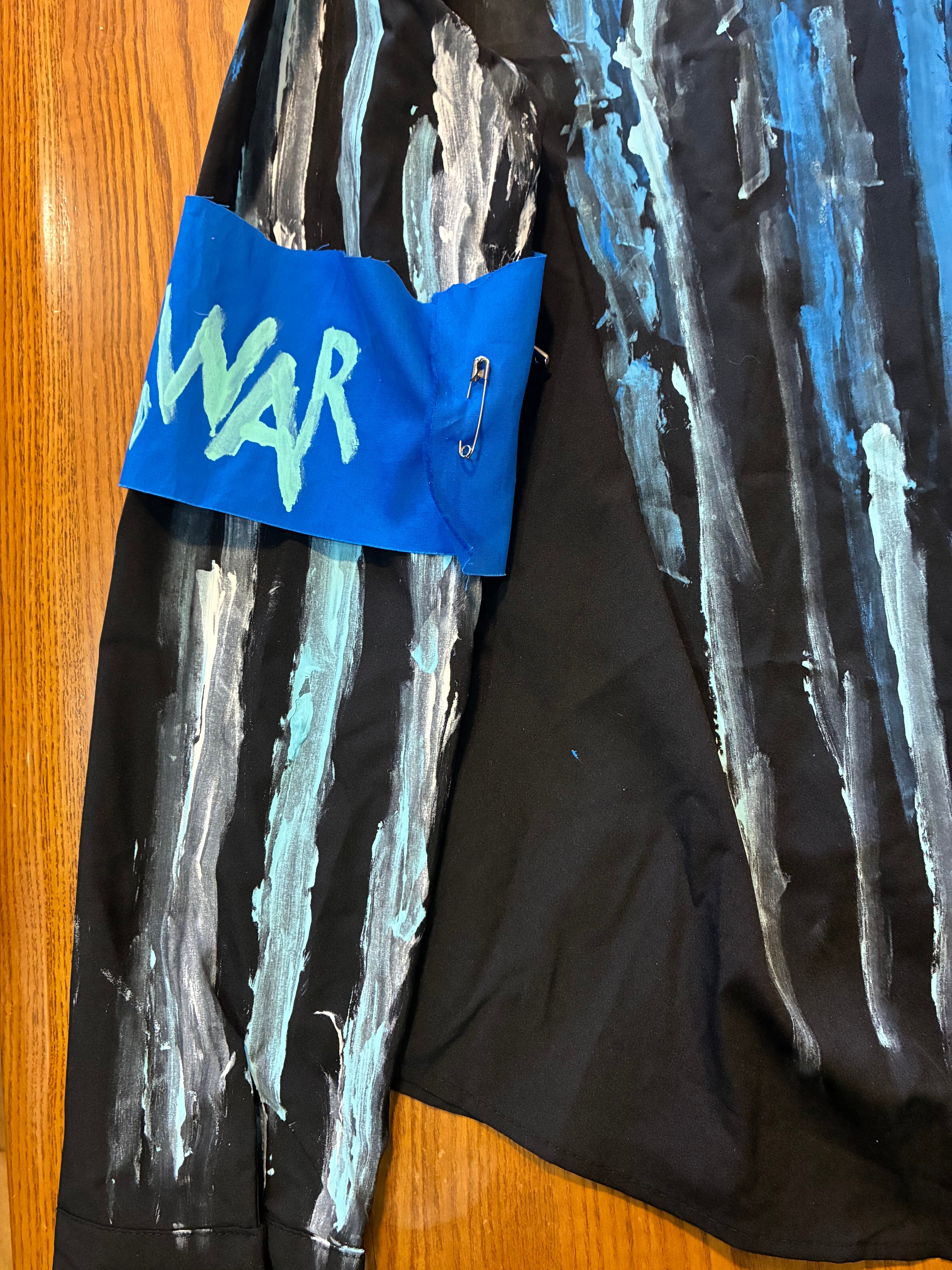スローガンパッチ、手書きのマルクスのプリント布パッチ、絵の具でのペイント、安全ピン、缶バッジ、クリップとめ、アフリカン生地安全ピン止め、腕章、などの加工をしました。青い布パッチは自作の散文を書きました。